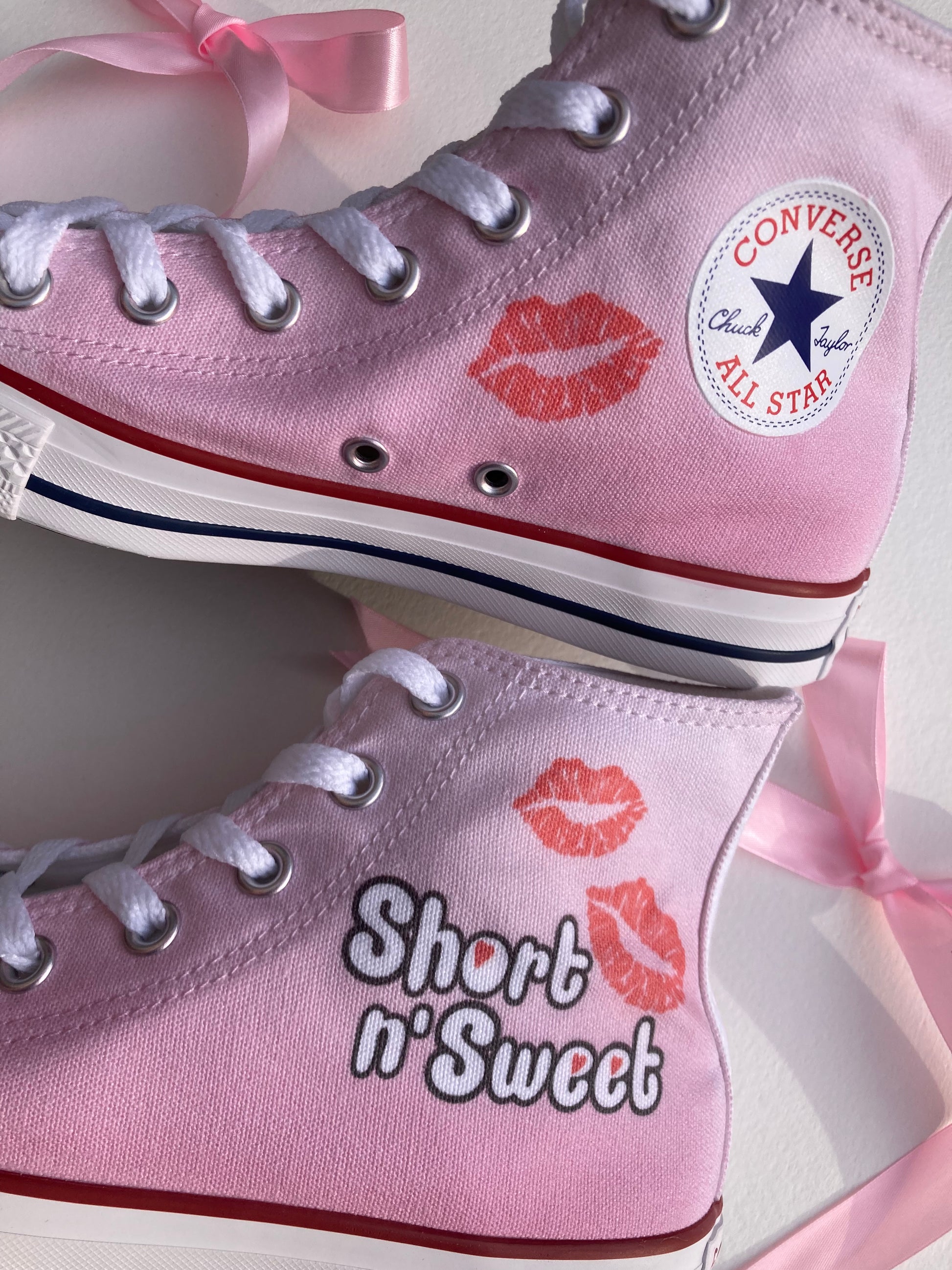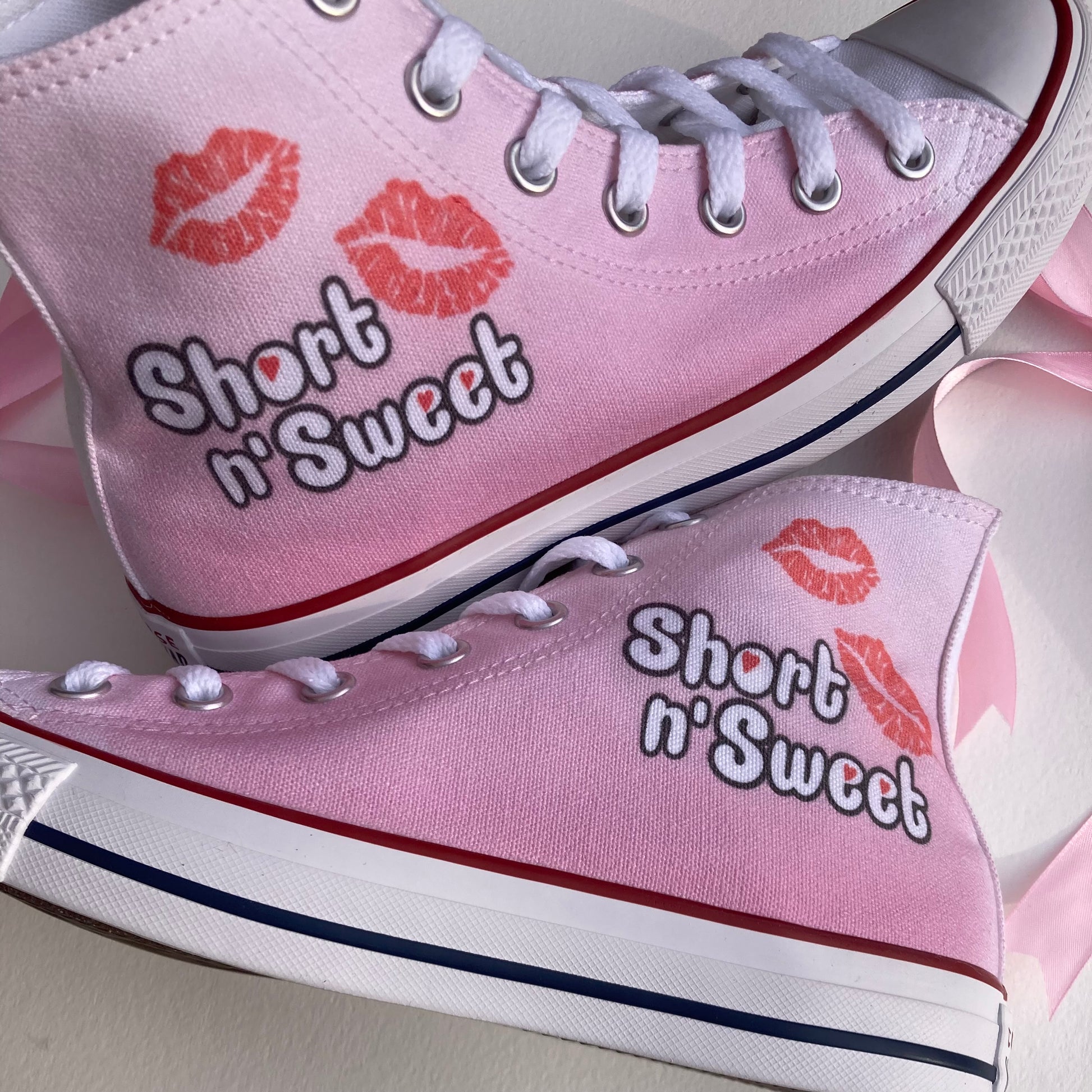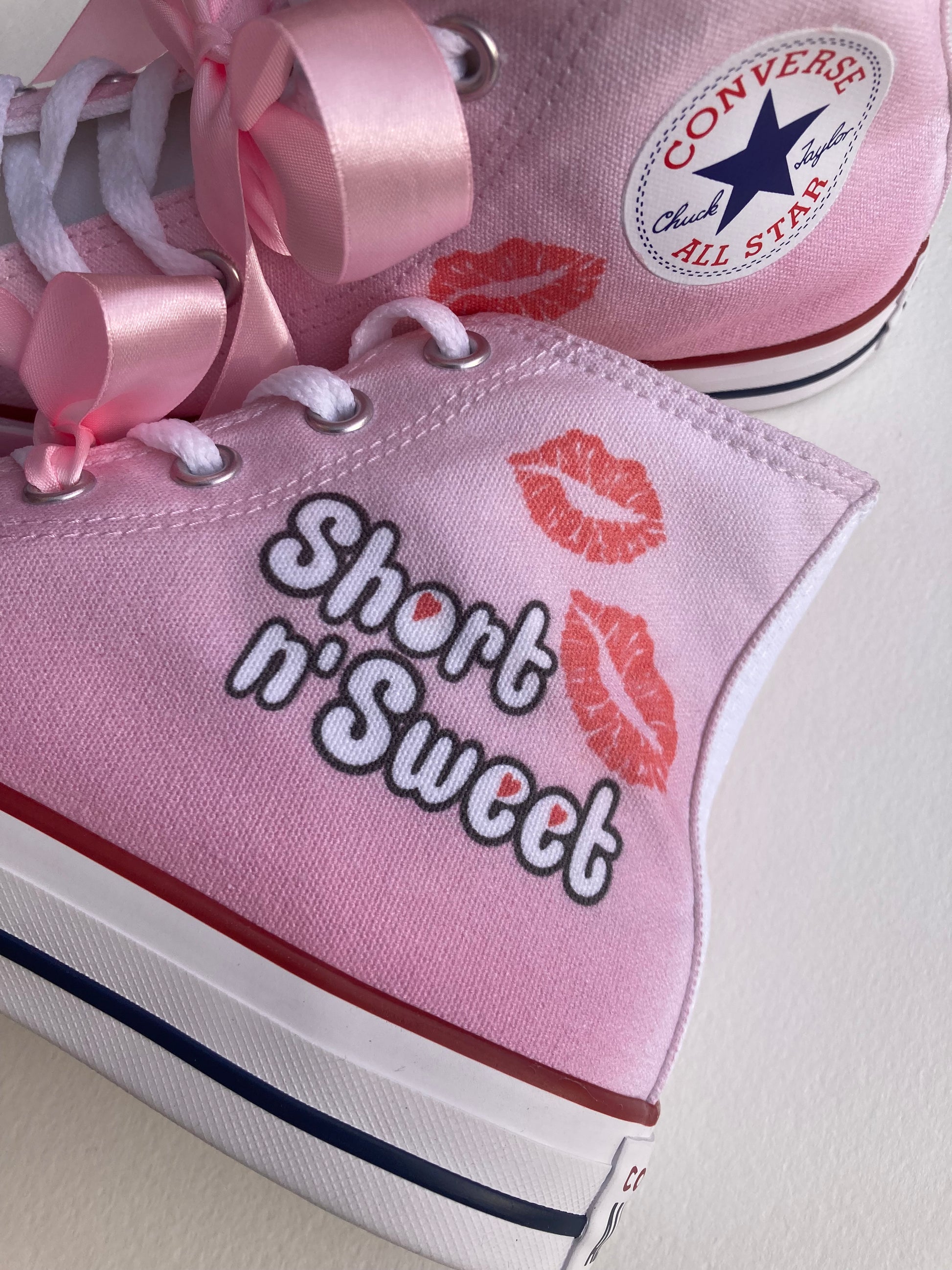 Step into style with our custom Sabrina Carpenter Converse sneakers, inspired by her iconic Short N' Sweet tour and album. These sneakers feature a stunning pink ombre design, transitioning from soft blush to pale pink for a beautiful look. The "Short N' Sweet" lettering on the sides pays tribute to Sabrina's latest work, while playful red lipstick kiss marks add a fun, flirty touch. Perfect for fans and fashionistas alike, these custom Converse are the ultimate way to express your love for Sabrina’s music and your unique style. Grab a pair before they're gone!
